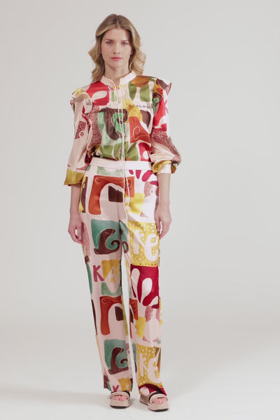 Camicia a maniche lunghe con cinturino regolabile sul collo, per un fiocco o una leggera scollatura, e volant sulle spalle che donano movimento. La stampa Amphora è la protagonista: delicata, artistica e luminosa. Tessuto leggero, caduta fluida e silhouette che valorizza la figura. Indossala con jeans, tailleur o gonna midi, dentro o fuori.
